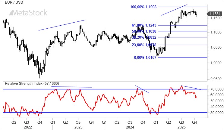 La differenza tra prezzo spot e media mobile a 200 giorni tocca ancora oggi livelli che in passato hanno favorito un riprezzamento del dollaro. Sarebbe molto grave se il biglietto verde perdesse fin da subito terreno nonostante queste condizioni tecniche. A quel punto avremmo un segnale inequivocabile che lo short dollaro sarebbe il trade ideale di questo finale di 2025.