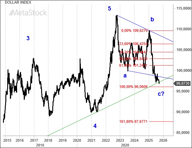Il grafico del Dollar Index su scala settimanale chiarisce molto bene la delicatezza tecnica del momento. Un calo ulteriore del 1% sul dollaro completerebbe una sequenza a zig zag A-B-C tipica di una correzione all’interno di un bull market di lungo periodo. Si esaurirà qui a ridosso della up trend line di lungo periodo il calo del biglietto verde? Se così fosse saremmo di fronte ad una occasione di acquisto, ma le riserve rimangono tante.