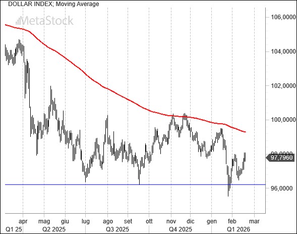 Il ghiaccio sul quale poggia la valuta americana è sottile. Se 1,19 rappresenta il livello cruciale nel rapporto con l’euro, sul DXY è 96,5/96,8 il punto critico.