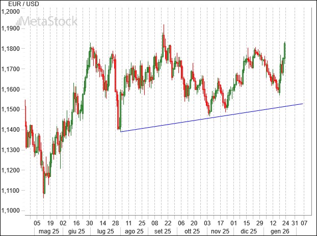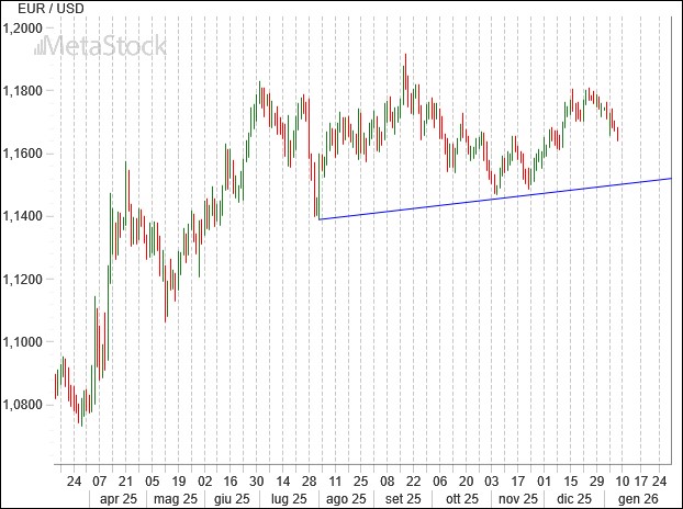 Ogni puntata verso il basso di EurUsd teoricamente rappresenterà una finestra di opportunità per coprire il rischio cambio dollaro, mentre uno strappo sopra 1.19 interromperebbe definitivamente una fase laterale preludendo a un 2026 ancora negativo per il biglietto verde.