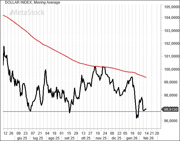 Il ghiaccio sul quale poggia la valuta americana è sottile. Se 1,19 rappresenta il livello cruciale nel rapporto con l’euro, sul DXY è 96,5/96,8 il punto critico.